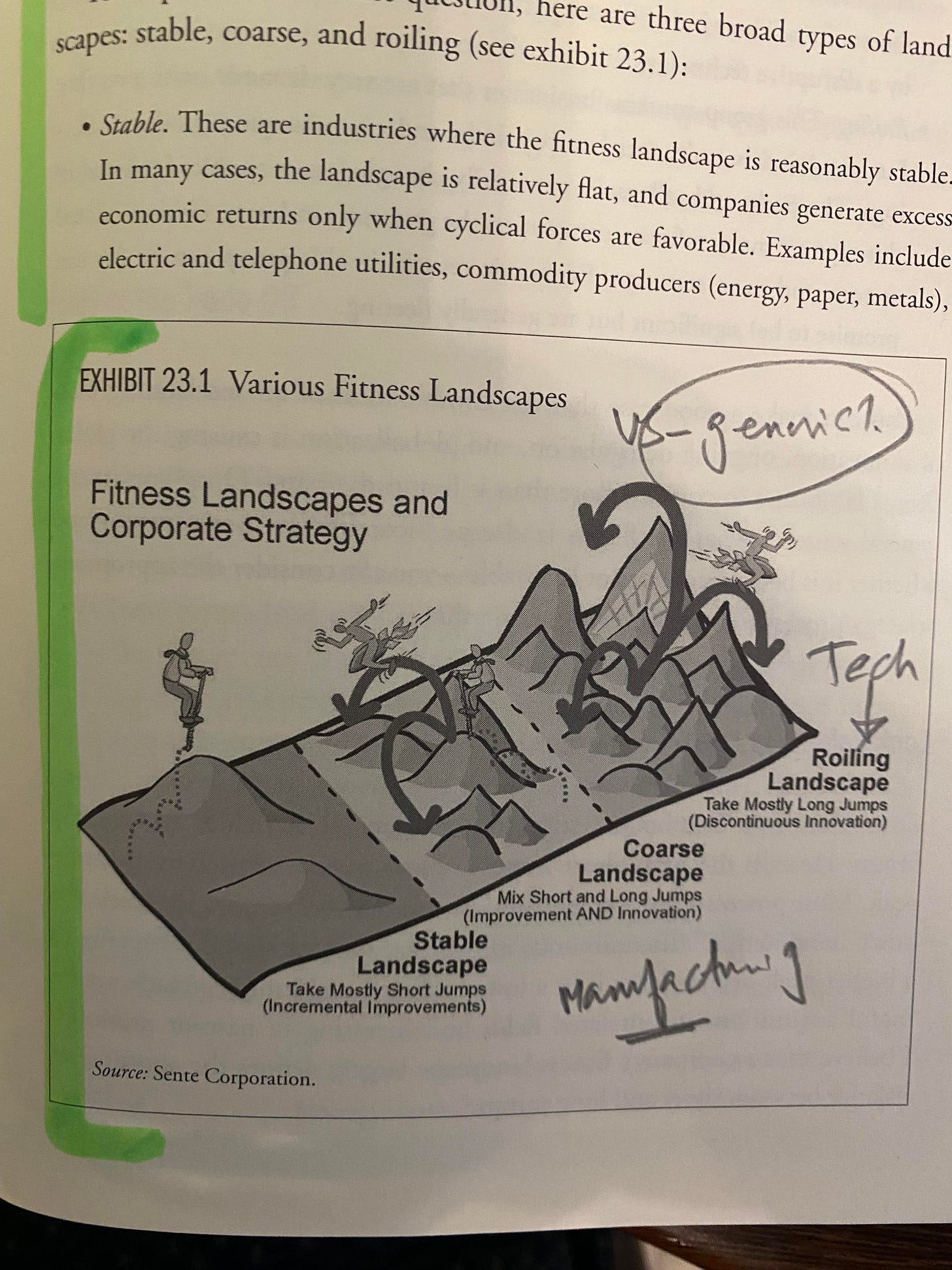 Now let’s shift to fitness landscapes, a concept originally from evolutionary biology. Biologists used it to explain how species adapt and survive; in business, it describes how companies create value and compete.