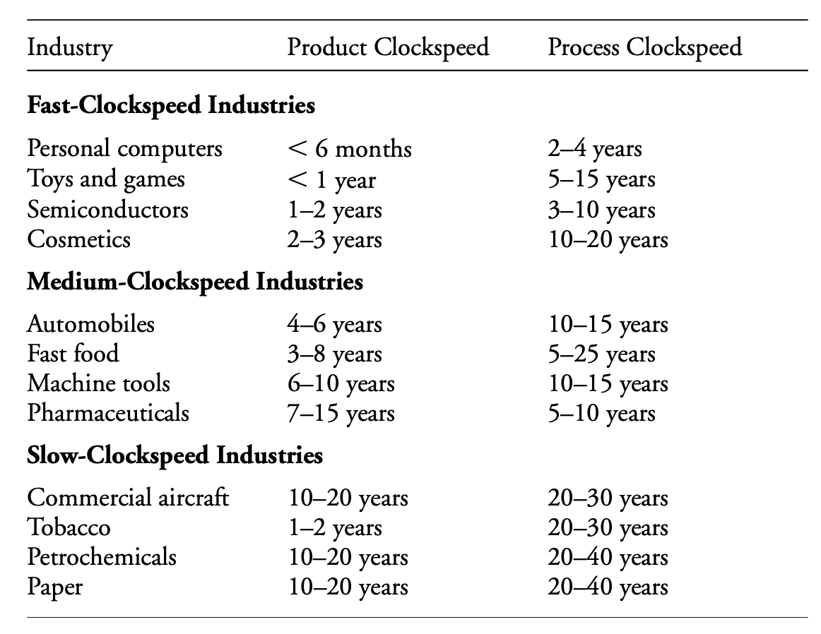 Take the pharmaceutical industry. It’s often labeled a “medium-clockspeed industry”. That means a new drug typically takes 7–15 years from development to launch, while improving processes (like manufacturing methods) can take around 5–10 years. Compare that to personal computers, where new models show up every 6 months — Pharma is slower, but still fast enough to really matter.